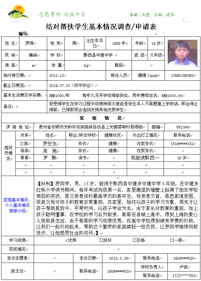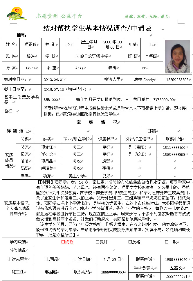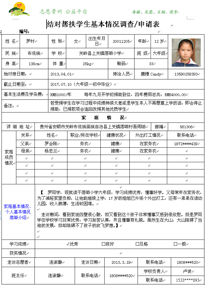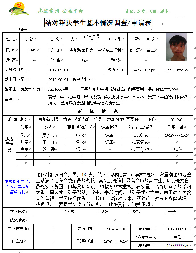 出生年月: 2001年12月05日 所在学校:关岭先上关镇落哨中学