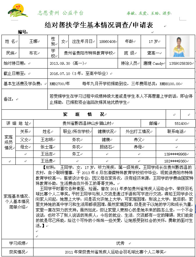 出生年月: 1996年04月08日 所在学校:贵州省贵阳市特殊教育学校
